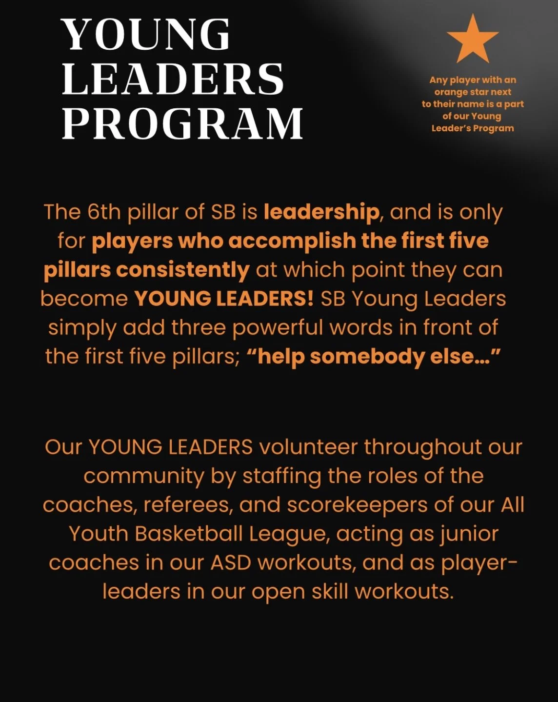 Young Leaders train and compete as a team as well as volunteering at our AYBL games as coaches and refs. They attend Thursday Leadership Lessons on Zoom and are encouraged to be recognizable amd welcoming faces in our gyms, leading by example and giving back to the SB community.